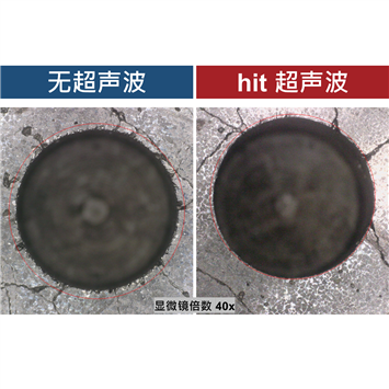 (图3. 相较无超声波加工, 使用汉鼎HBT40模组后, 崩边尺寸明显减小, 钻孔质量提升5倍)