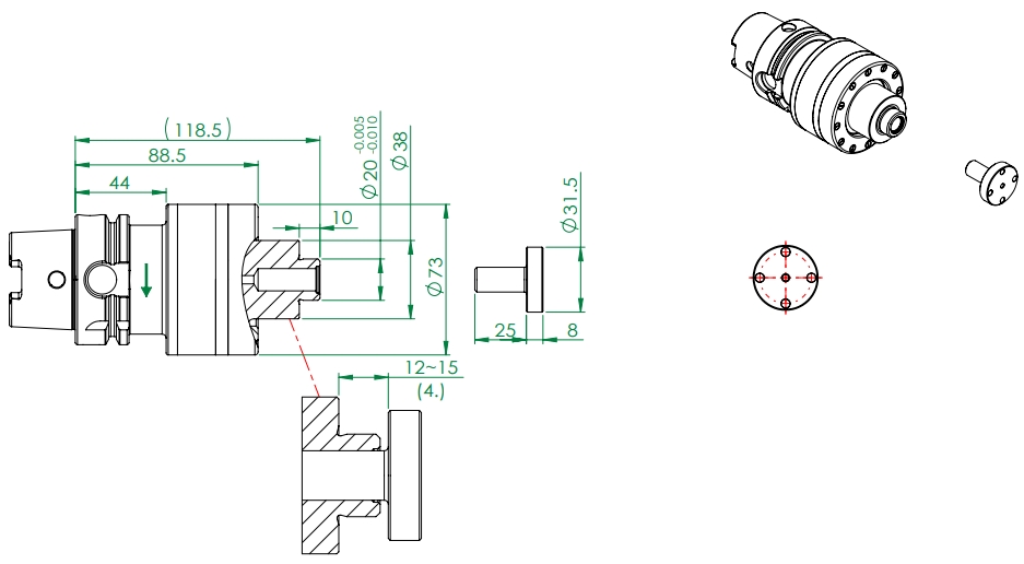 HSK-A63-W01-2010 Ultraschall-Schleifscheibenaufnahmen: Produktzeichnung & Abmessungen