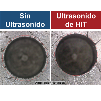 (Figura 2. Con el módulo de mecanizado ultrasónico HIT HBT40 en la perforación de discos de freno de carbocerámicos, ayuda a reducir el tamaño de las grietas en los bordes en comparación con el proceso sin ultrasonido)