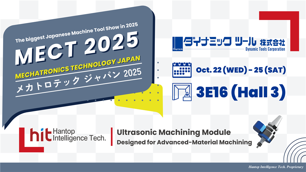 MECT 2025 | Dynamic Tools Corp. ダイナミックツール株式会社 x HIT Ultrasonic 2025/09/30 MECT 2025 | Dynamic Tools Corp. ダイナミックツール株式会社 x HIT Ultrasonic The biggest Japanese Machine Tool Show in 2025 — the MECT 2025 — will be held from October 22 to 25 at Port Messe, Nagoya! 📅 Date: Oct. 22nd (Wed.) ~ 25th (Sat.), 2025 🕑 Time: 10:00 AM - 5:00 PM (Last day till 4:00 PM) 👣 Location: Port Messe Nagoya, Exhibiton Hall 3 🎪 Booth: 3E16 🤝 In cooperation with Dynamic Tools Corporation ダイナミックツール株式会社 🔗 Visitor Pre-Registration MECT is Japan's largest domestic equipment and technology show, held biennially in the autumn. This year marks the 20th edition, bringing together machinery manufacturers, component suppliers, and equipment providers from Japan and abroad. Visitors will discover cutting-edge, innovative manufacturing technologies and products. At the previous exhibition, MECT 2023, Hantop Intelligence Tech. (HIT) collaborated with its Japanese distributor Dynamic Tools Co., Ltd. (ダイナミックツール株式会社) to showcase ultrasonic-assisted machining technology, including applications for new semiconductor materials such as silicon carbide (SiC) and quartz glass. This year, HIT will once again join forces with Dynamic Tools to present the latest UD7 ultrasonic drive module and ultrasonic grinding toolholder series. In addition, the booth will highlight ultrasonic machining applications for advanced semiconductor packaging materials such as Aluminum Silicon Carbide (AlSiC), demonstrating their effectiveness in rough grinding. 🎬 WATCH NOW to learn how the new material Aluminum Silicon Carbide (AlSiC) will be applied in high-end semiconductor packaging in the future! Interested in exploring more about ultrasonic machining for next-generation semiconductor materials⁉️ Visit us at MECT 2025 in Nagoya, Port Messe, Hall 3, Booth 3E16, and discover the possibilities of ultrasonic.💝 - Hantop Intelligence Tech. ✨Ultrasonic Process Solution for Advanced Materials✨ ☎️ +886-4-2285-0838 📧 sales@hit-tw.com ←Back